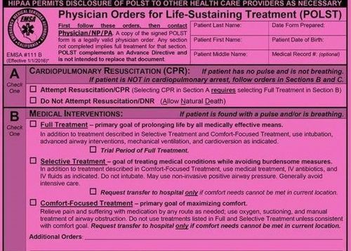 The Physician Orders for Life-Sustaining Treatment (POLST) form is an important aspect of advanced care planning. Unlike traditional advance directives, the POLST form is a set of medical orders that provides seriously ill or frail patients with more specific control over their end-of-life care. It is a signed medical order that your healthcare team can act upon, allowing individuals to express their preferences regarding various medical treatments in detail. The POLST form is printed on bright pink paper and signed by the patient (or their appointed decisionmaker) and a healthcare professional, ensuring that the patient's wishes are clearly communicated and legally recognized. When patients cannot communicate their wishes, the POLST form serves as a clear guide for family members and caregivers, eliminating any confusion about the types of treatments the patient does or does not want. Having a clear plan in place can bring peace of mind to the patient and their family members during a difficult time. The POLST form is a valuable tool for outlining care preferences during an emergency or at the end of life, which can help reduce stress and alleviate feelings of burden, guilt, and depression in caregivers or family members. With a set plan in place, loved ones can focus on grieving and processing their emotions without the added pressure of making difficult decisions.